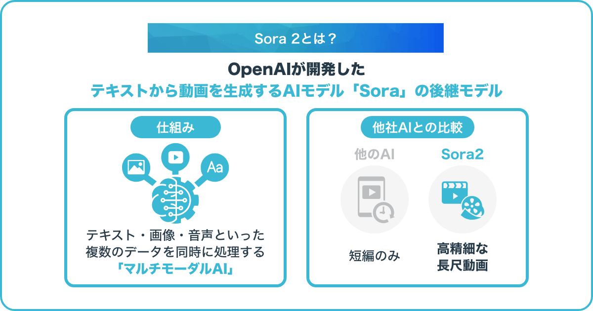 Sora 2は、テキスト・画像・音声といった複数のデータを同時に処理する「マルチモーダルAI」です。