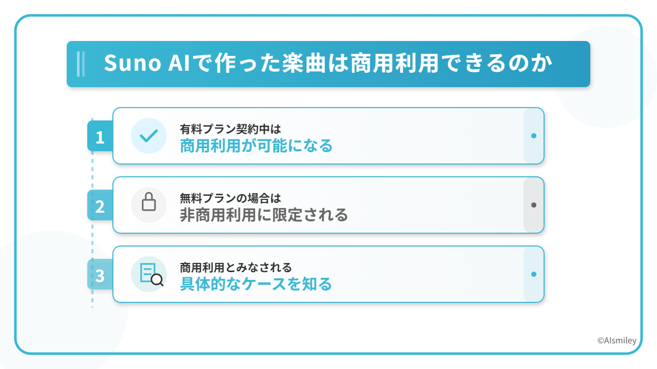 Suno AIを使った楽曲の商用利用については、プランによって大きく権利が異なることがわかりました。有料プランでは商用利用が可能である一方、無料プランでは非商用に限定されています。