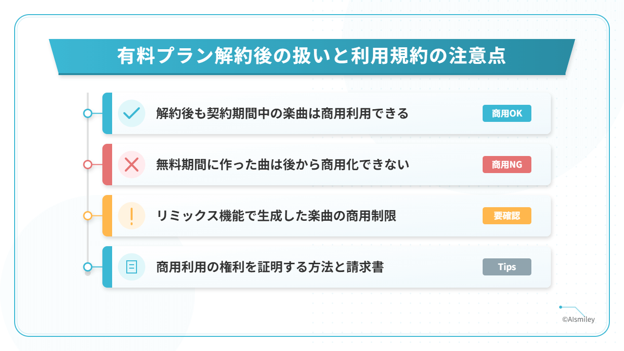 ただし注意点として、解約後に新たに生成する楽曲については、無料プランの制限が適用されるため非商用利用のみとなります。有料契約中に作成した楽曲のリストは、万が一の権利証明のためにも保存しておくことをおすすめします。