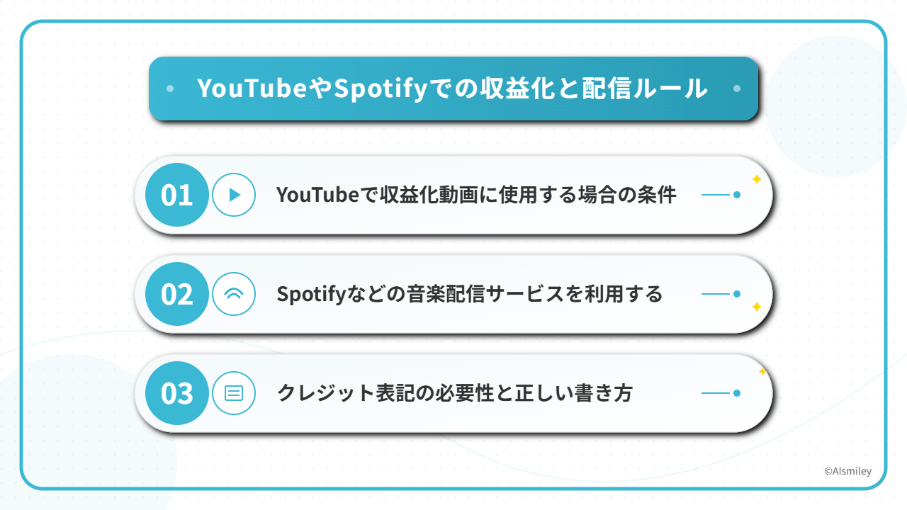 • YouTubeやSpotifyなどでの収益化には適切なクレジット表記が必須