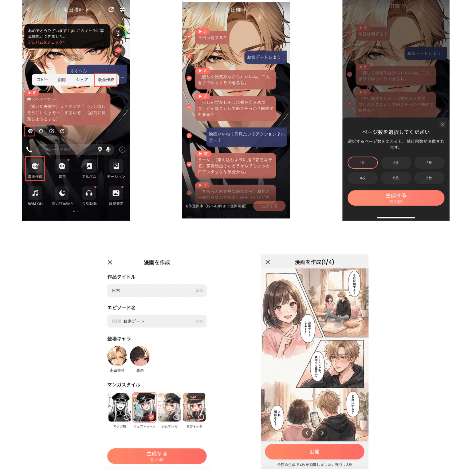 • AIキャラクターとのチャットから漫画を生成することも可能