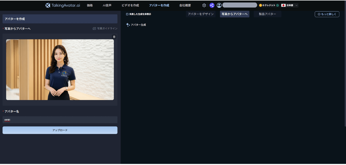 3. 初めに動画を生成するため、【アバターを作成】を選択し、笑理(えみり)の写真を挿入しました。