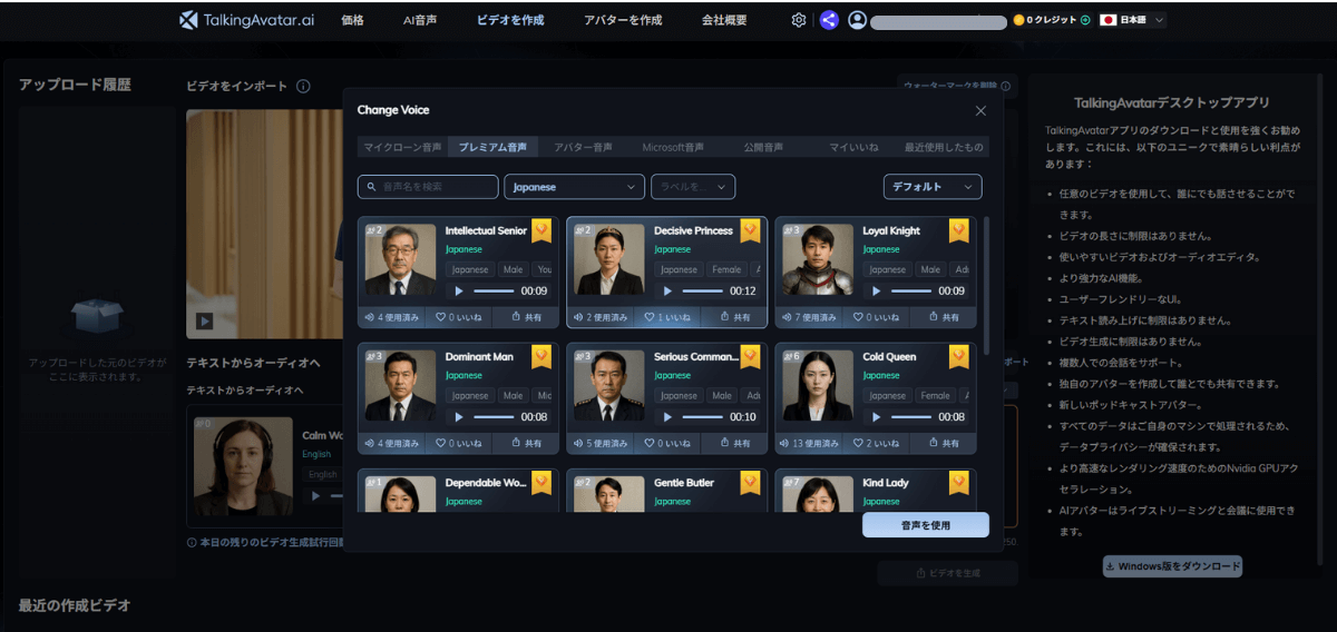 6. 次は、音声を選択しました。日本語の音声も豊富で、今回は、落ち着いた女性の声を選択しました。
