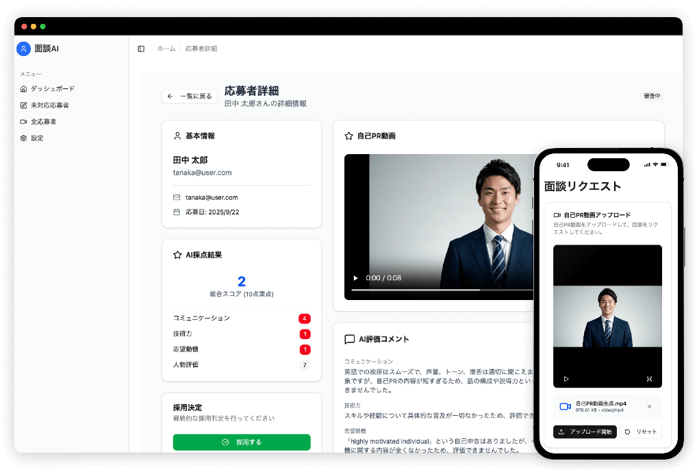 「面談AI」では、AIによる動画解析技術を活用し、企業の面談業務の効率化を支援します。求職者が提出する自己PR動画をAIが自動解析し、スコアと判定理由を生成し、採用担当者は採用可否の一助として活用できます。