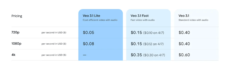 画像出典:Googleキーワード「当社の最もコスト効率の高いビデオ生成モデルであるVeo 3.1 Liteで構築しましょう」