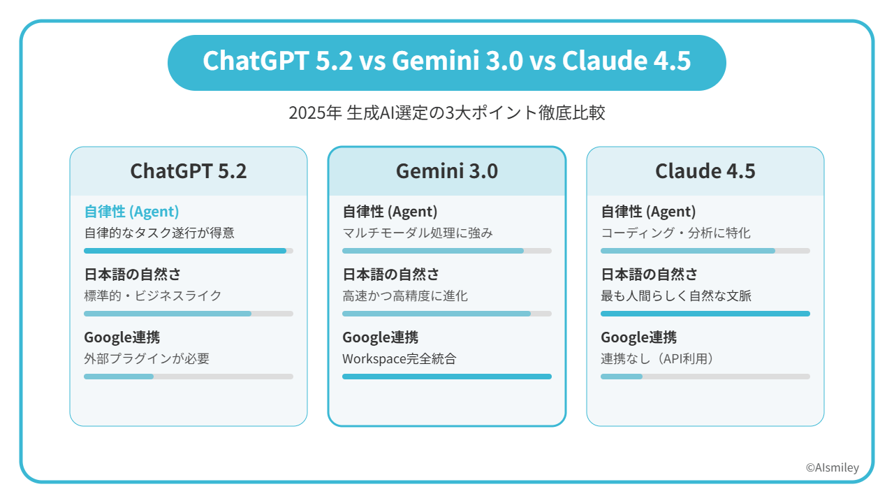 2025年現在、生成AI選びで迷っている担当者のために、主要3モデルのスペックと特徴を一覧化しました。 特に「自律性(エージェント機能)」「日本語の自然さ」「Google Workspaceとの連携」の3点が大きな選定基準となります。