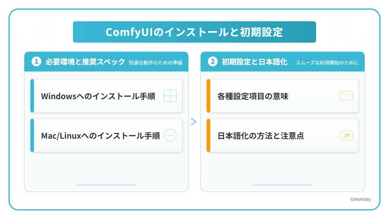 その後、OSに応じたインストール手順に従ってComfyUIをセットアップします。初期設定では、各種パラメータの調整や日本語化を行い、使いやすい環境を整えます。これらの手順を丁寧に進めることで、ComfyUIを快適に利用できる準備が整います。