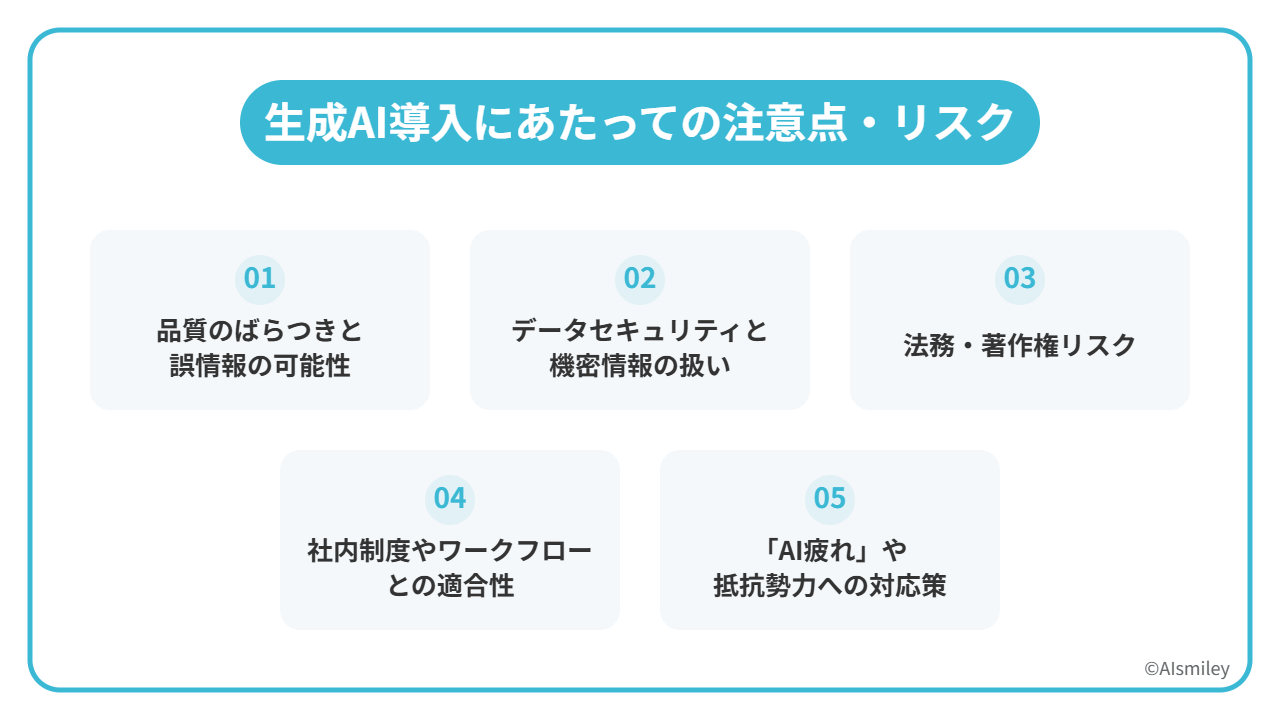 生成AI導入においては、いくつか注意点があります。その注意点について、解説しましょう。