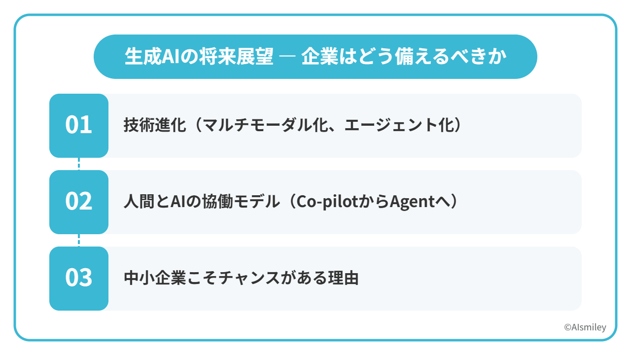 例えば、 数名のマーケティングチームがAIで業務を自動化し、大企業と同等の発信量を実現する例も増えています。スピード感を持って導入できる中小企業は、生成AIを競争力に変えるチャンスが大きいといえます。