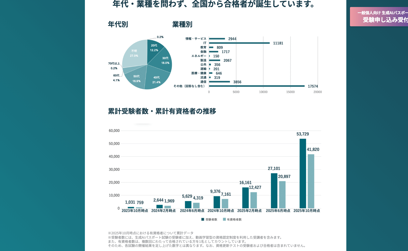 実際に、公開データによると累計受験者数は2023年10月時点:1,031名、2024年10月時点:9,376名、2025年10月時点:53,729名と、約2年間で約50倍規模へ拡大しています。