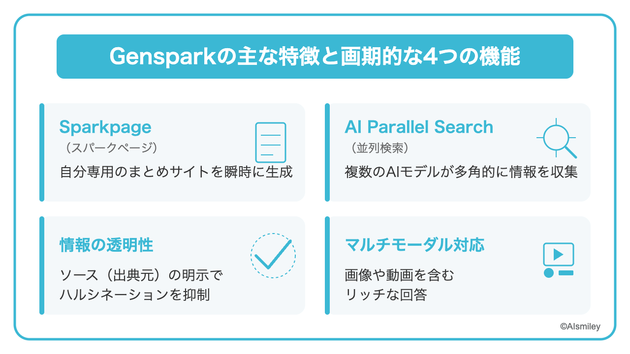Gensparkには、従来の検索エンジンとは大きく異なる革新的な機能が複数搭載されています。ここでは特に注目されている4つの機能を紹介します。