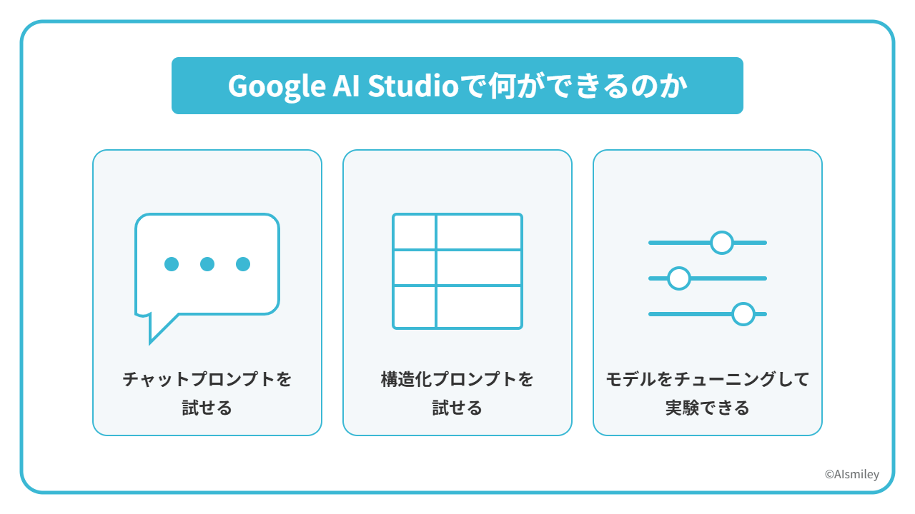 Google AI studioとは、Googleが提供するAI開発向けの実験環境で、さまざまなAIモデルにプロンプトを入力しその応答の違いを比較できます。
