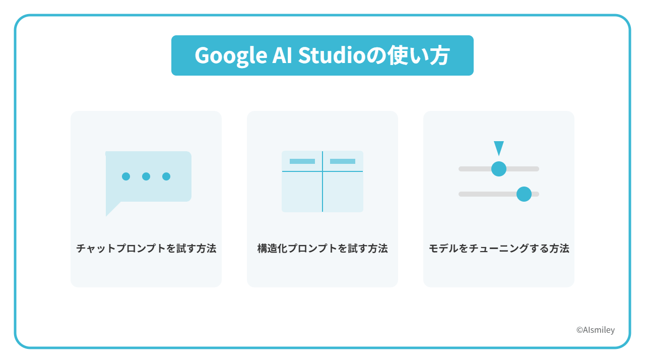 Google AI studioではチューニングという手法を使用して、AIモデルが特定の方法や方向性で動作するように調整することができます。