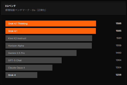 Grok 4.1は、人の気持ちを理解する力(感情的知性)と、新しいアイデアを生み出す力(創造性)の両方で、テストで一番良い成績を取りました。