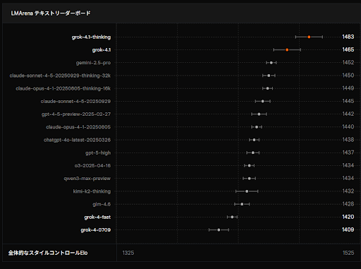 Grok 4.1は、実際に利用者が「どのAIの回答が一番良いか」を評価するテスト(LMArena Text Arena)で、総合1位になりました。