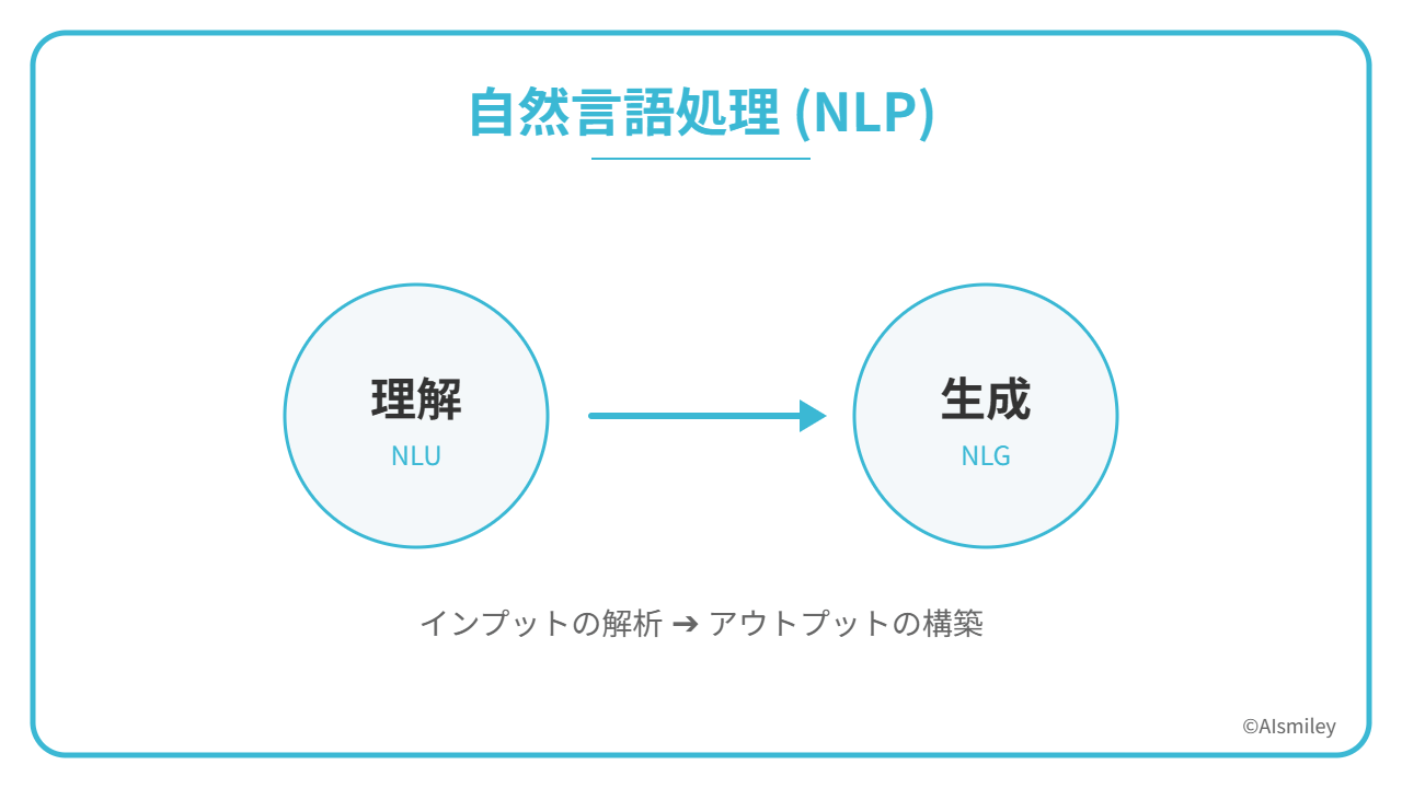 自然言語理解とは、自然言語処理の内の一分野であり、「テキストや音声の構文(文の文法的構造)、意味(文が意図する意味)解析を使用することで文の意味を判別していく技術」です。