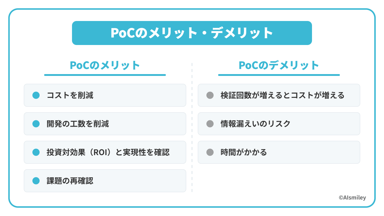 PoCには、どのようなメリットがあるのでしょうか。また、デメリットとしてはどのような点が考えられるのでしょうか。PoCのメリット・デメリットについて詳しくみていきましょう。