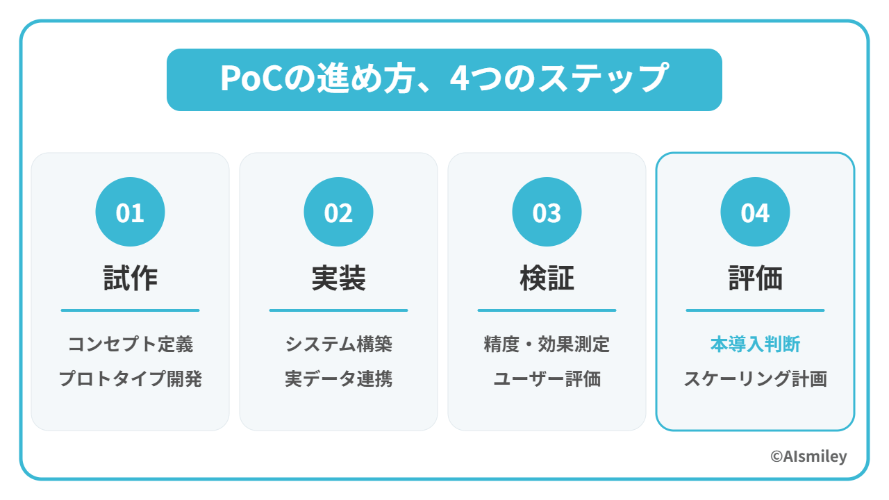 PoCの実施手順は主に、「試作」→「実装」→「検証」→「評価」の4ステップです。
