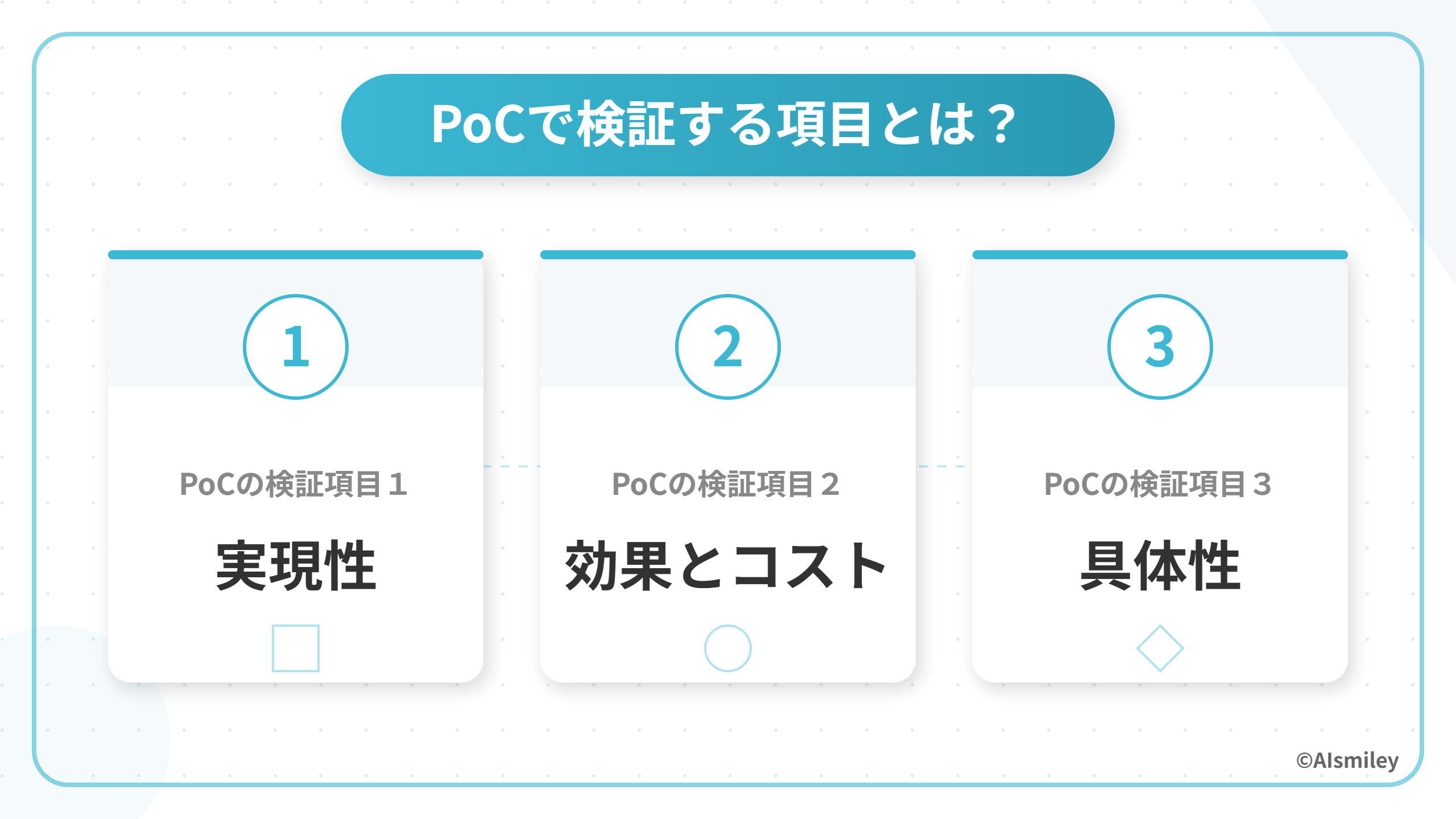 PoCは、課題の再確認が行いやすいというメリットもあります。後ほど詳しくご紹介しますが、PoCには行った検証を評価するプロセスも含まれるため、現状の課題がどのような部分なのかを可視化することが可能です。