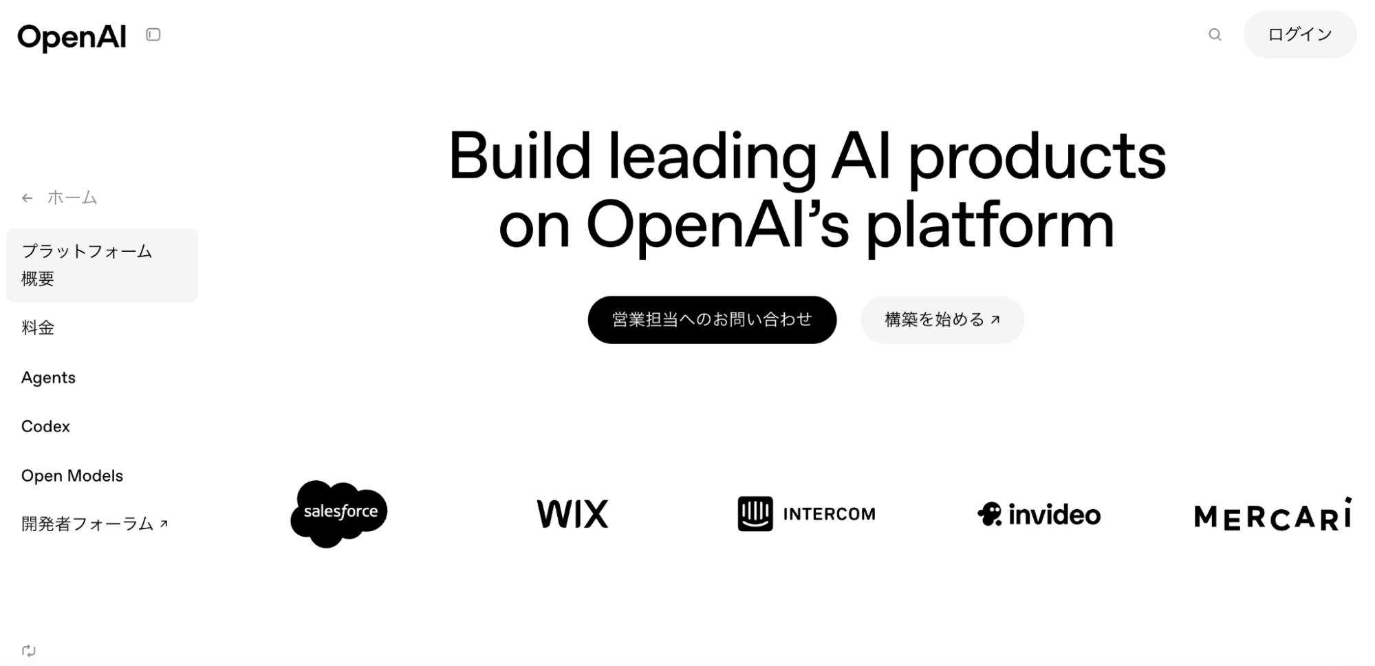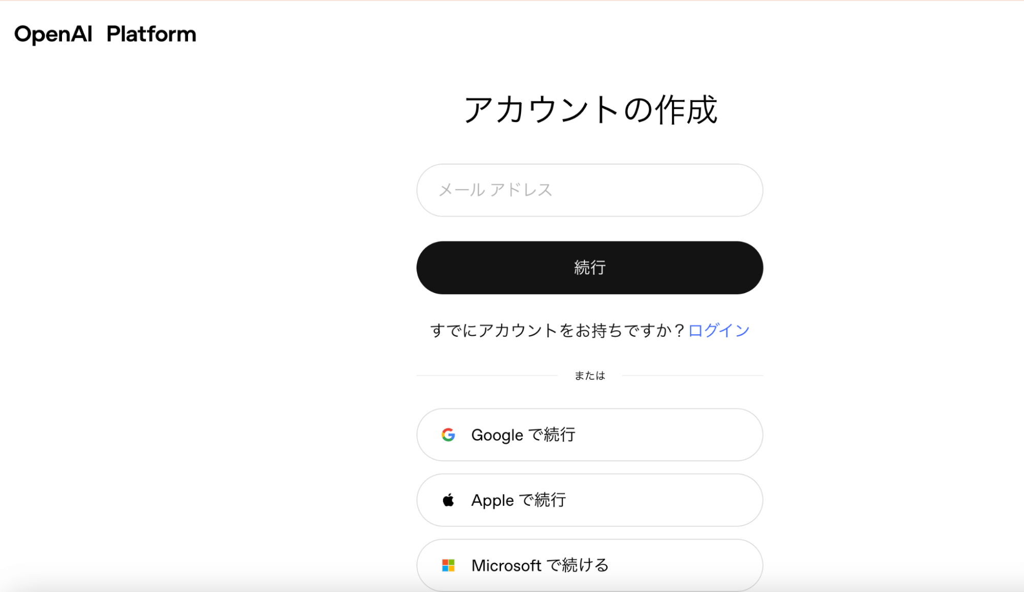 まず、OpenAIアカウントを開設するために、サイトにアクセスします。画面中央に表示されている「ログイン」からAPIプラットフォームを選択し、アカウント作成に進みます。