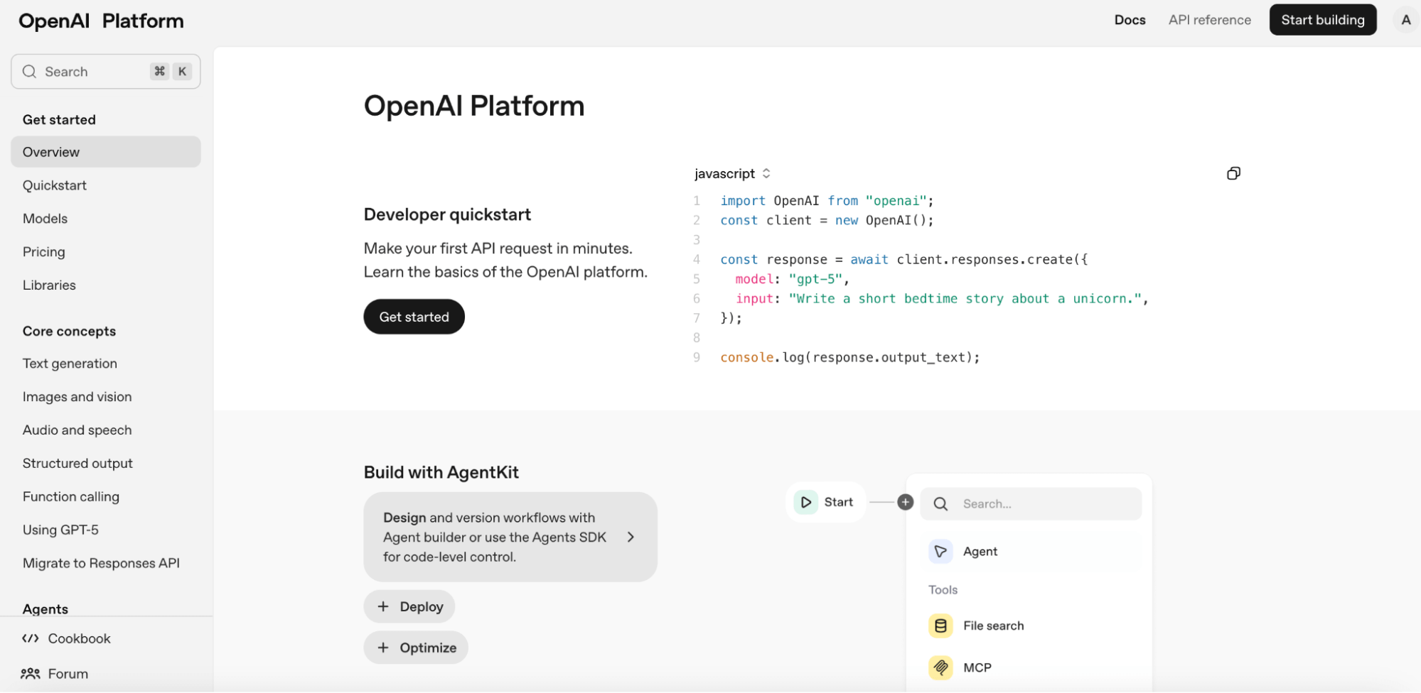 OpenAIにサインアップしたら、続いてAPIキーを取得します。サイトにアクセスしたら、右上のStart buildingをクリックします。企業か個人か、利用目的などを入力する画面が出ますので、自分の所属に従って入力します。