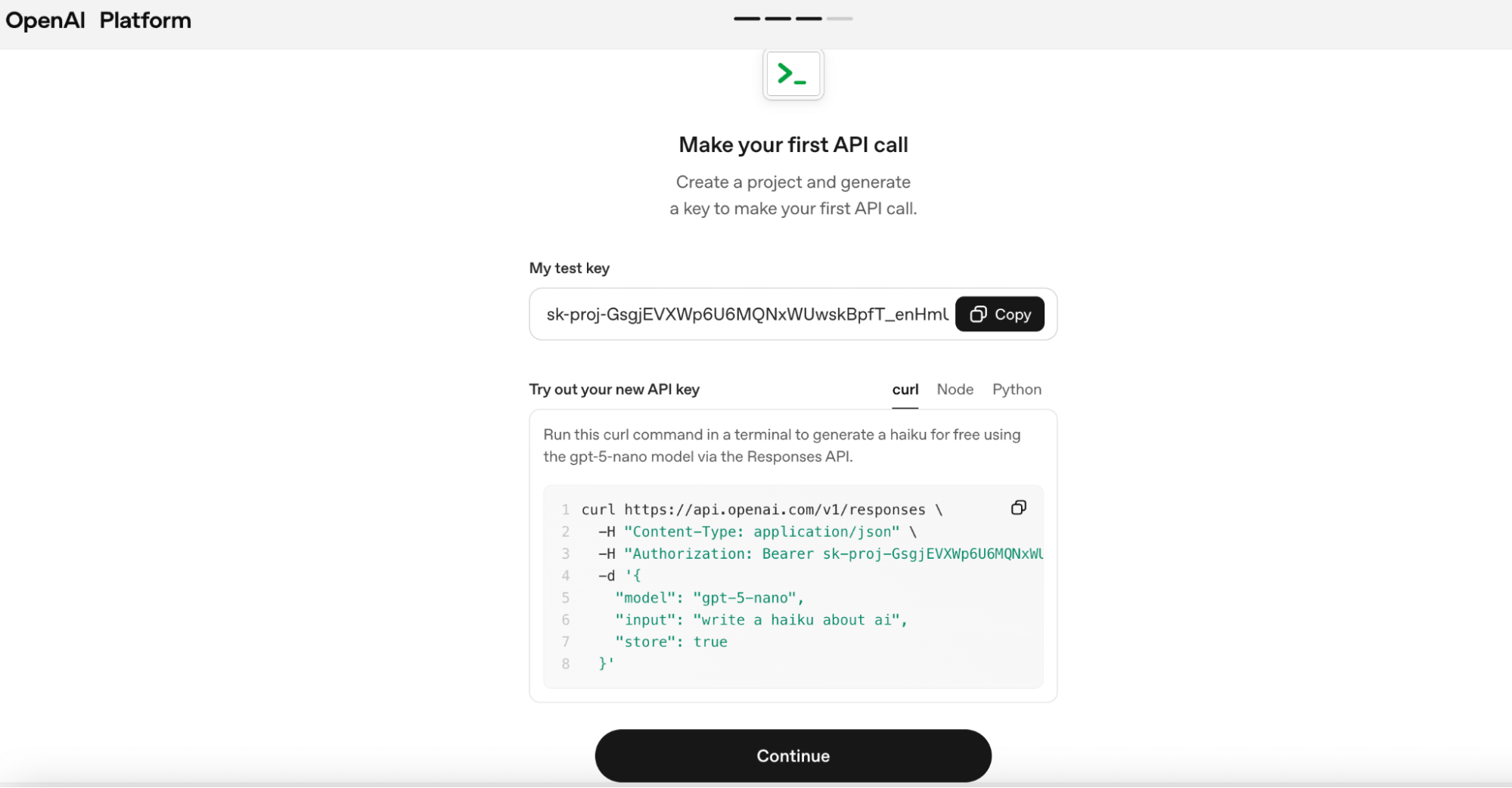 Make your first API callという画面でキーが表示されます。キー(sk-…)が表示されるのは最初の一度だけです。必ずコピーして安全な場所に保存してください。見失った場合は、古いキーをRevokeし、Create new secret keyで新しいキーを発行して使います。