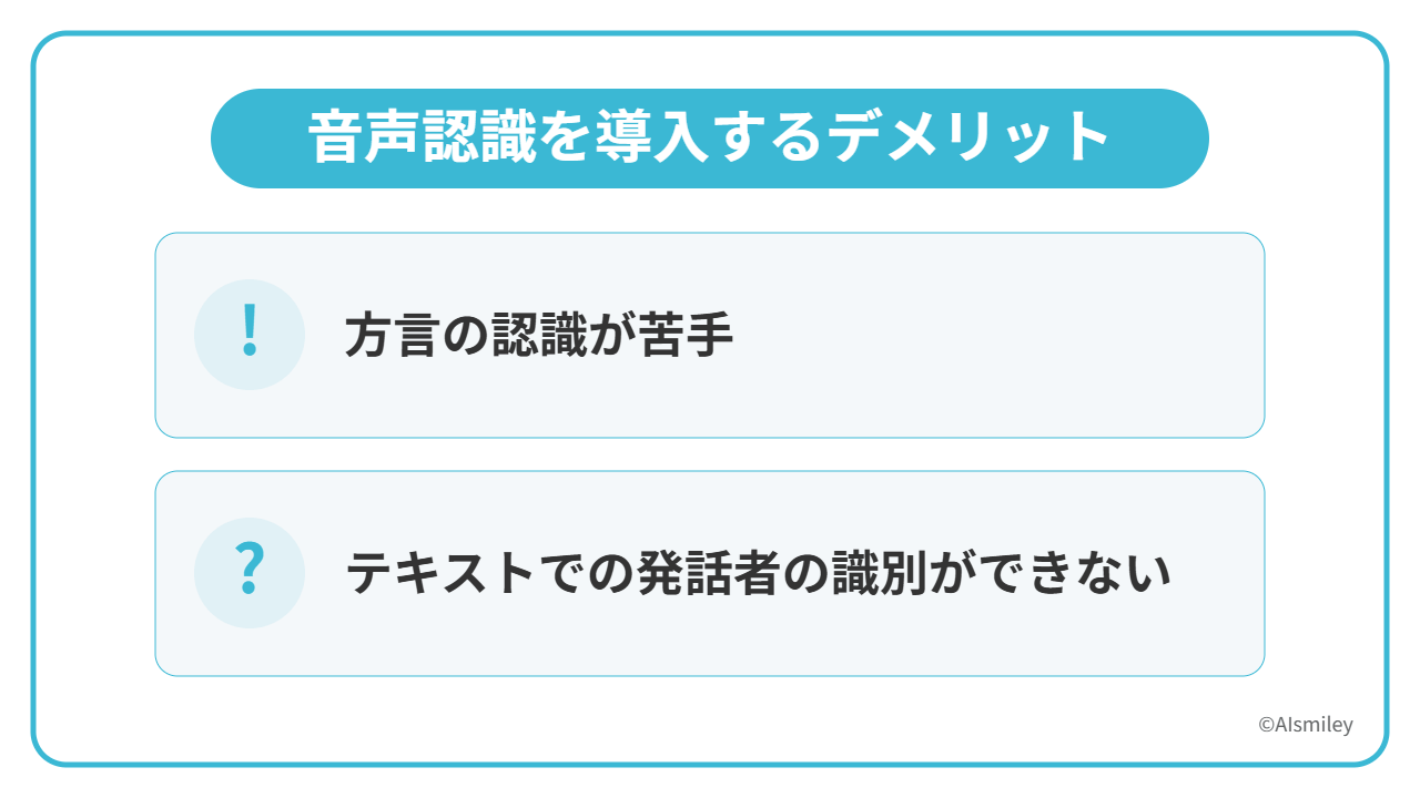 しかし、導入にあたって注意すべき課題もいくつか存在します。ここでは、特に問題なりがちな「方言の認識が苦手」「テキストでの発話者の識別ができない」という二つの点についてご説明いたします。