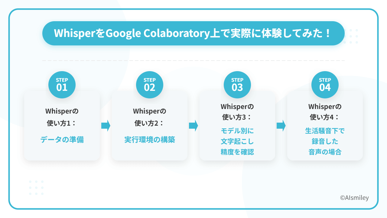 OpenAIが発表した音声認識モデル「Whisper」は、日本語の音声でも精度高く文字起こしできるツールとして知られています。今回はアイスマイリー編集部が「AIニュース原稿の読み上げ音声を素材にどのくらい精度高く文字起こしできるのか」や「生活騒音下における読み上げ音声でも結果は変わらないのか」について調べてみましたので是非やり方を真似して試してみてください。