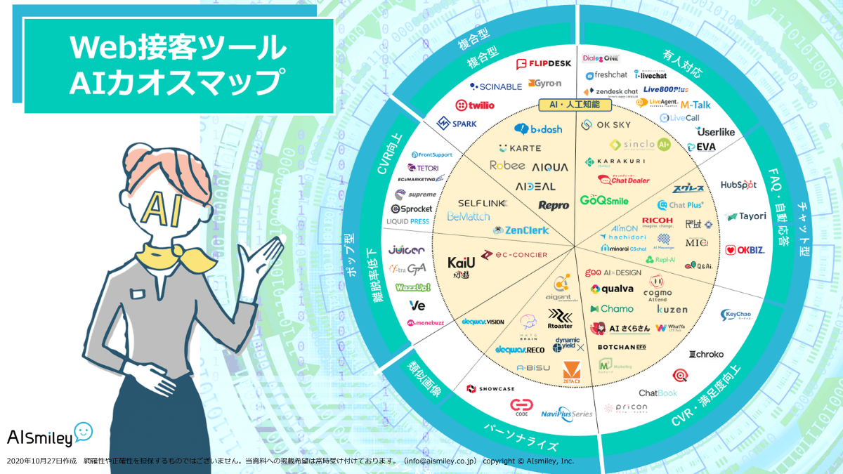 数ある「Web接客ツール」の中から、自社の課題や導入の目的にあった「Web接客ツール」を選び出すのは容易ではありません。そんな時に役立つのが、「Web接客の手法」と「導入の目的」別にセグメントされたWeb接客ツールAIカオスマップです。