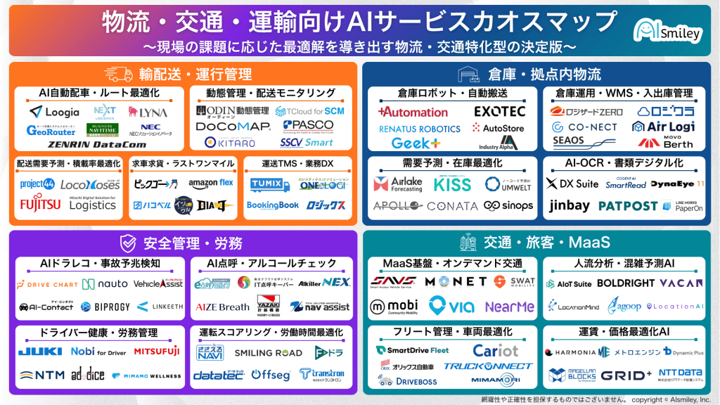 そこでAIsmileyでは、現場の課題解決に直結する物流・交通・運輸業界向けAIサービス90製品以上を厳選。大きく4つのカテゴリに分類し、2026年問題への対策や導入検討をスムーズに進めるためのカオスマップとして整理いたしました。