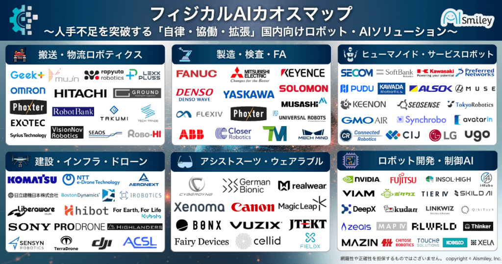 自律走行搬送ロボット(AMR)や協働ロボット、ヒューマノイド、ドローンといった「ロボット・ハードウェア(身体)」に加え、それらに高度な判断力や視覚・触覚を与える「開発・制御AI(脳)」まで、一つのマップに集約しました。