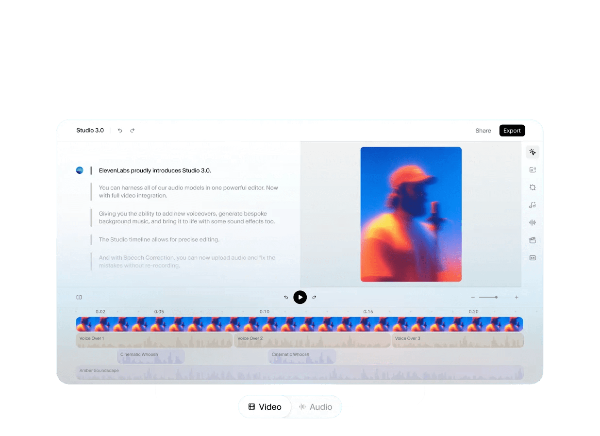 ナレーションやビデオ制作、オーディオブック、ゲーム開発まで、高品質な音声コンテンツ制作を効率化するオールインワンのプラットフォームです。