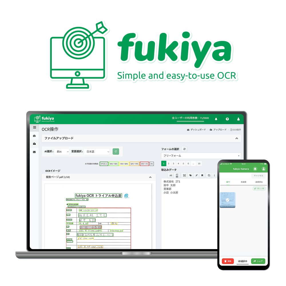 fukiyaOCRは初期費用0円で始められるシンプルなOCR製品です。直感的な操作で書類をデータ化できます。