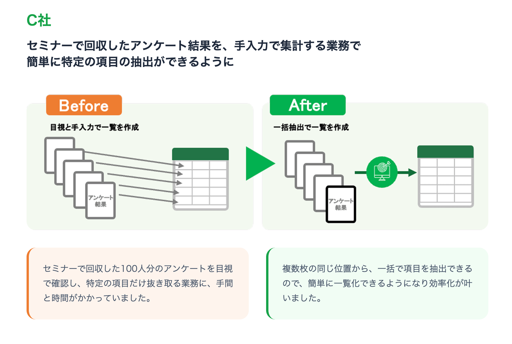 高精度OCRで手書きにも強い!人の目で読める字であれば、ほぼ正確に読み取ることができます。OCR結果の精度が見える枠線付きで、確認作業を最小限に抑えられます。