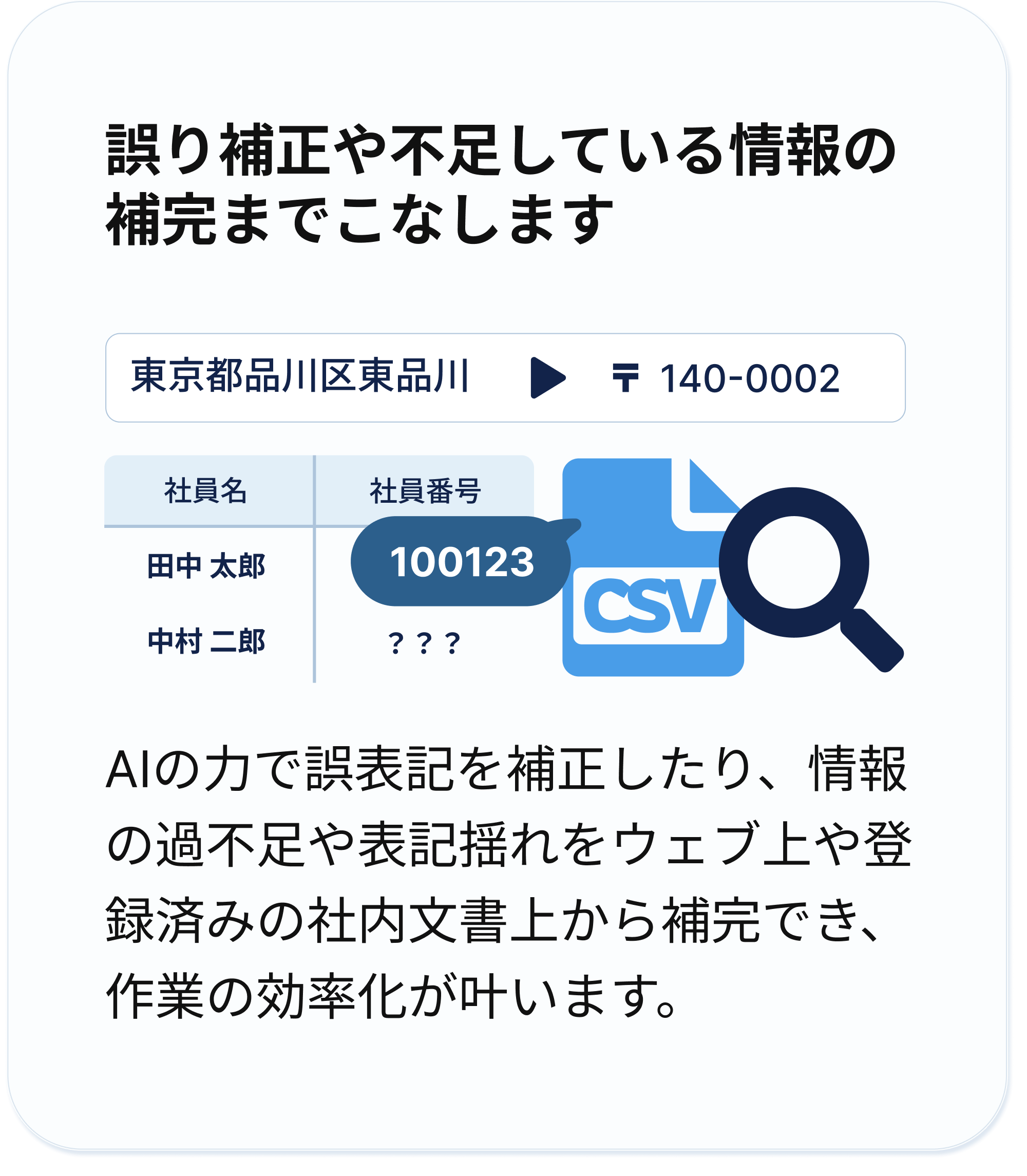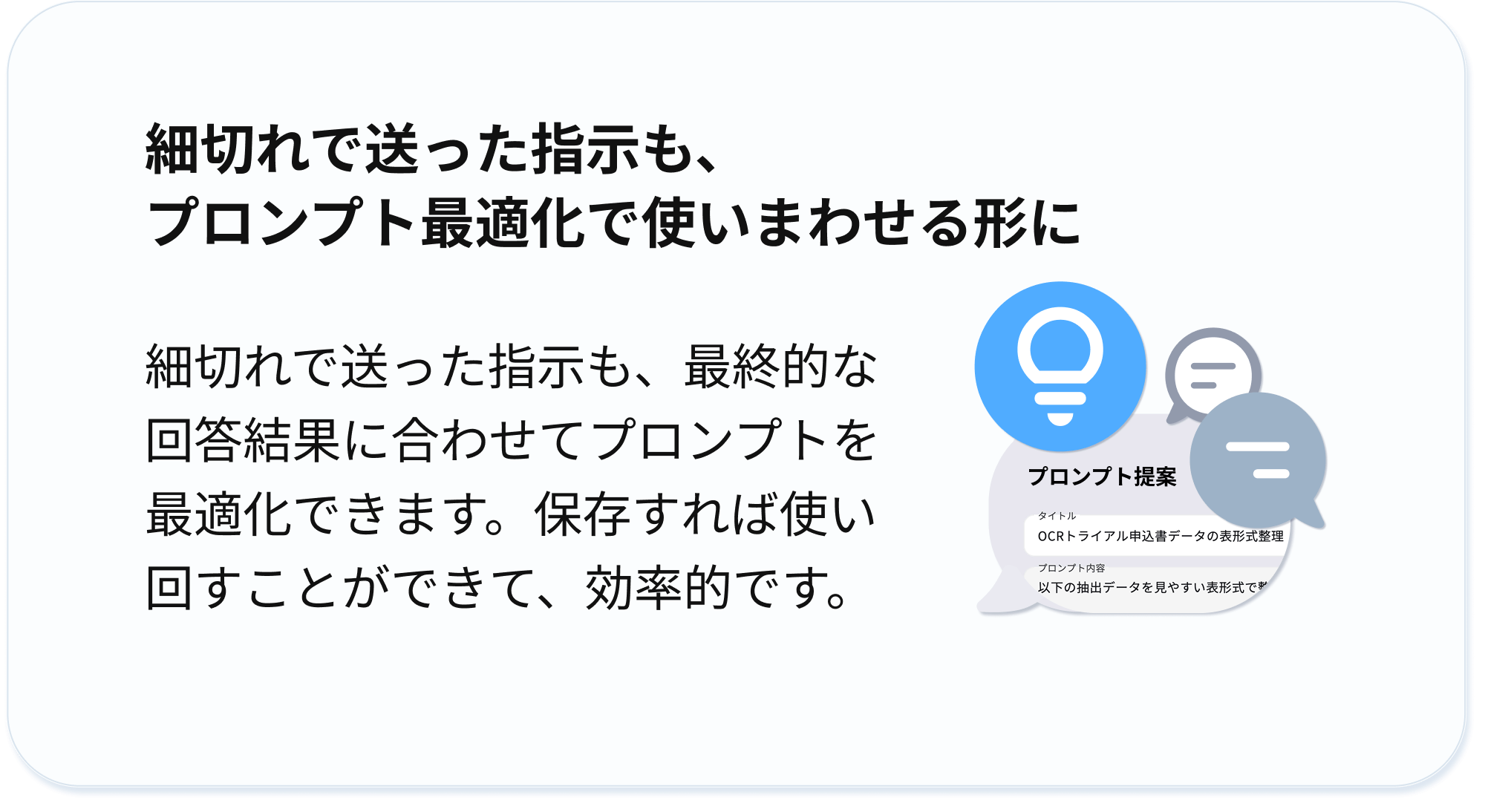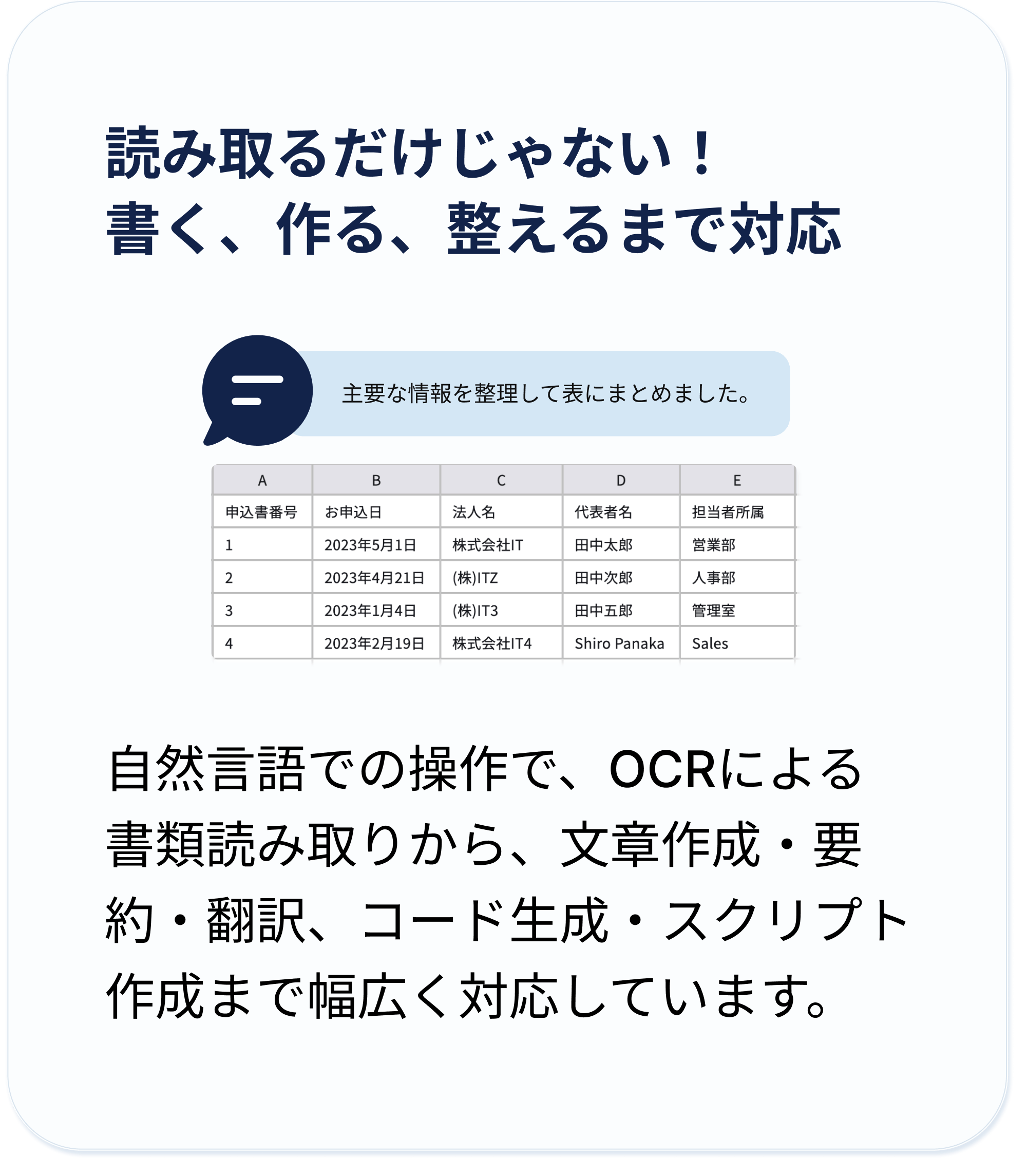 紙・PDF・画像・Excel/CSVも、自然言語の指示だけで決まったフォーマットへ一括変換。前処理を自動化し、手入力や作業時間を大幅削減。
