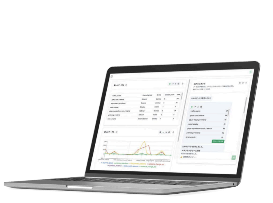 気になる数値や必要な情報に対してAIが自動でコードを生成可能です。 代理店に頼らずとも誰でも数値分析が可能に。出力したデータから次の一手を自動提案