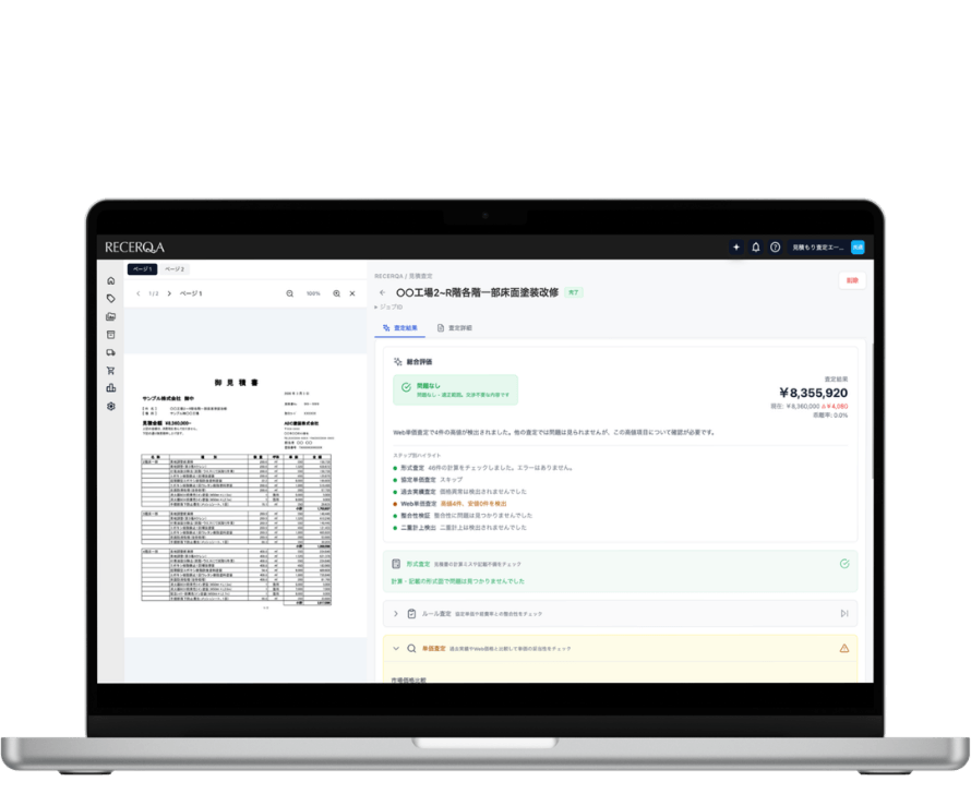 RECERQA 受発注エージェントは、受発注現場のベテランの暗黙知を、AIエージェントで変革するエンタープライズ向けソリューションです。見積査定・品番特定・受注登録・発注最適化・見積作成・納品消込の6つのAIエージェントを用意しており、お客様が抱える課題に応じて必要なエージェントを選択・組み合わせてご提供します。