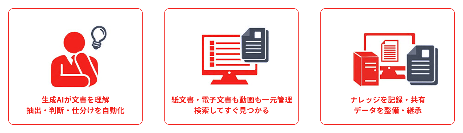 テキスト情報が埋め込まれていないPDFや画像にも対応し、人手と時間がかかっていた文書の仕分けや判定まで、生成AIがサポート。ナレッジが自然に貯まるファイル管理が実現できます。