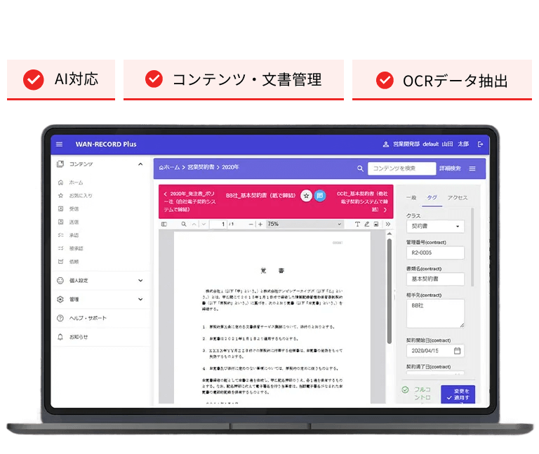 WAN-RECORD Plusは必要とするデータをすぐに取り出せる環境作りが可能です。決裁書・契約書・技術資料などをデータベース化して検索したり、生成AIの自動項目抽出によって注文書・請求書・納品書からの転記や手入力負担を軽減、また文書の判定機能によって新リース会計に該当するかどうかや、反社条項有無の判定をすることも可能です。